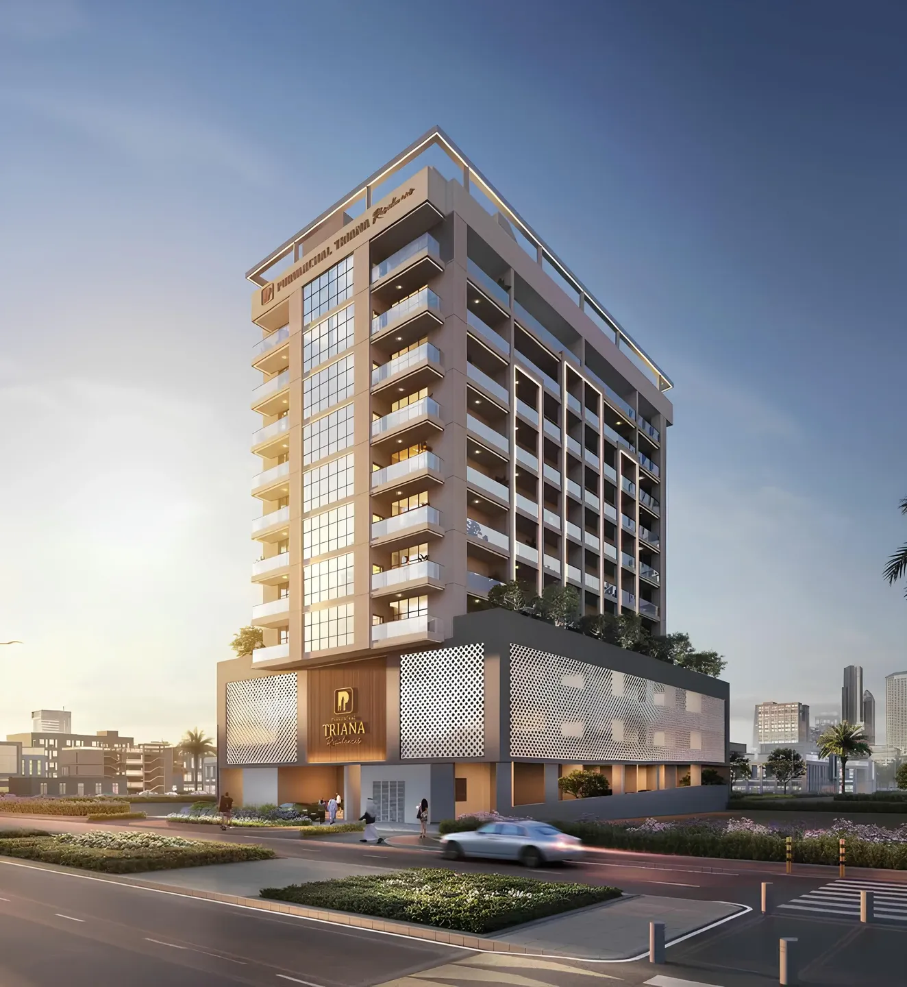 Purvanchal Triana Residences is a modern residential project by Purvanchal Development, located in a prestigious area of Dubai. The building consists of a ground floor, two podium levels, eight residential floors, and a rooftop.